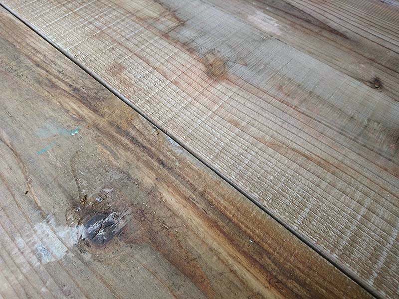 板が薄いが故に長さ方向への貫通割れが多いです。使い勝手を考慮し、端部から片手サイズ(約200mm)程度までを目安に割れの入った板が混入します。※それ以上大きな貫通割れの板は自社製造のインテリア商品のパーツとして再利用しております。 ※[貫通した割れ]ではない[表面のみの割れ]であれば使用に支障がないと判断し、端部から200mm以上であっても含まれております。 ※古材側の端部から約100mm程度までを目安にカケの入った板が混入します。(写真参照) ●仕上げ